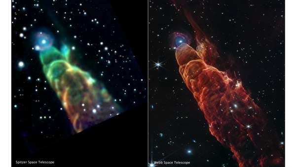 Це порівняння показує зображення HH 49/50 (ліворуч), отримане інфрачервоною масивною камерою космічного телескопа Спітцер, і зображення того ж об’єкта (праворуч), отримане за допомогою інструментів NIRCam (камера ближнього інфрачервоного діапазону) і MIRI (інструмент середнього інфрачервоного діапазону). На Веббівському зображенні видно складні деталі розігрітого газу і пилу, коли протозоряний струмінь врізається в речовину. Вебб також дозволив розрізнити “розмитий” об’єкт, розташований на кінчику витікання у віддалену спіральну галактику. NASA’s Webb Telescope Unmasks True Nature of the Cosmic Tornado