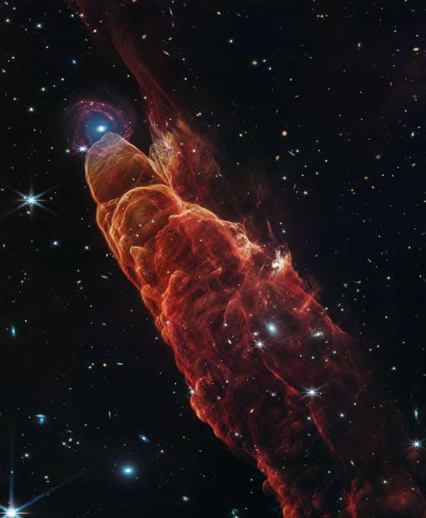 Космічний телескоп НАСА імені Джеймса Вебба спостерігав Гербіг-Харо 49/50, потік від сусідньої зорі, яка ще формується, у ближньому та середньому інфрачервоному світлі з високою роздільною здатністю. Складні особливості потоку, представлені в червонувато-оранжевому кольорі, дають детальні підказки про те, як формуються молоді зорі і як їхня реактивна активність впливає на навколишнє середовище. NASA’s Webb Telescope Unmasks True Nature of the Cosmic Tornado