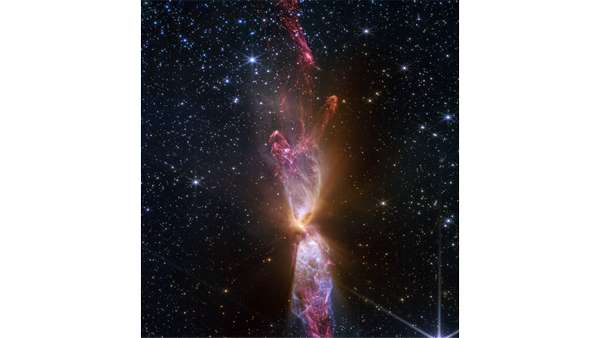 Телескоп Вебб виявляє, що деякі зоряні струмені мають викривлену або деформовану структуру. У правому верхньому куті помітна помаранчева дуга – це ударний фронт. Тут викиди зірок сповільнились через зіткнення з щільнішим матеріалом.