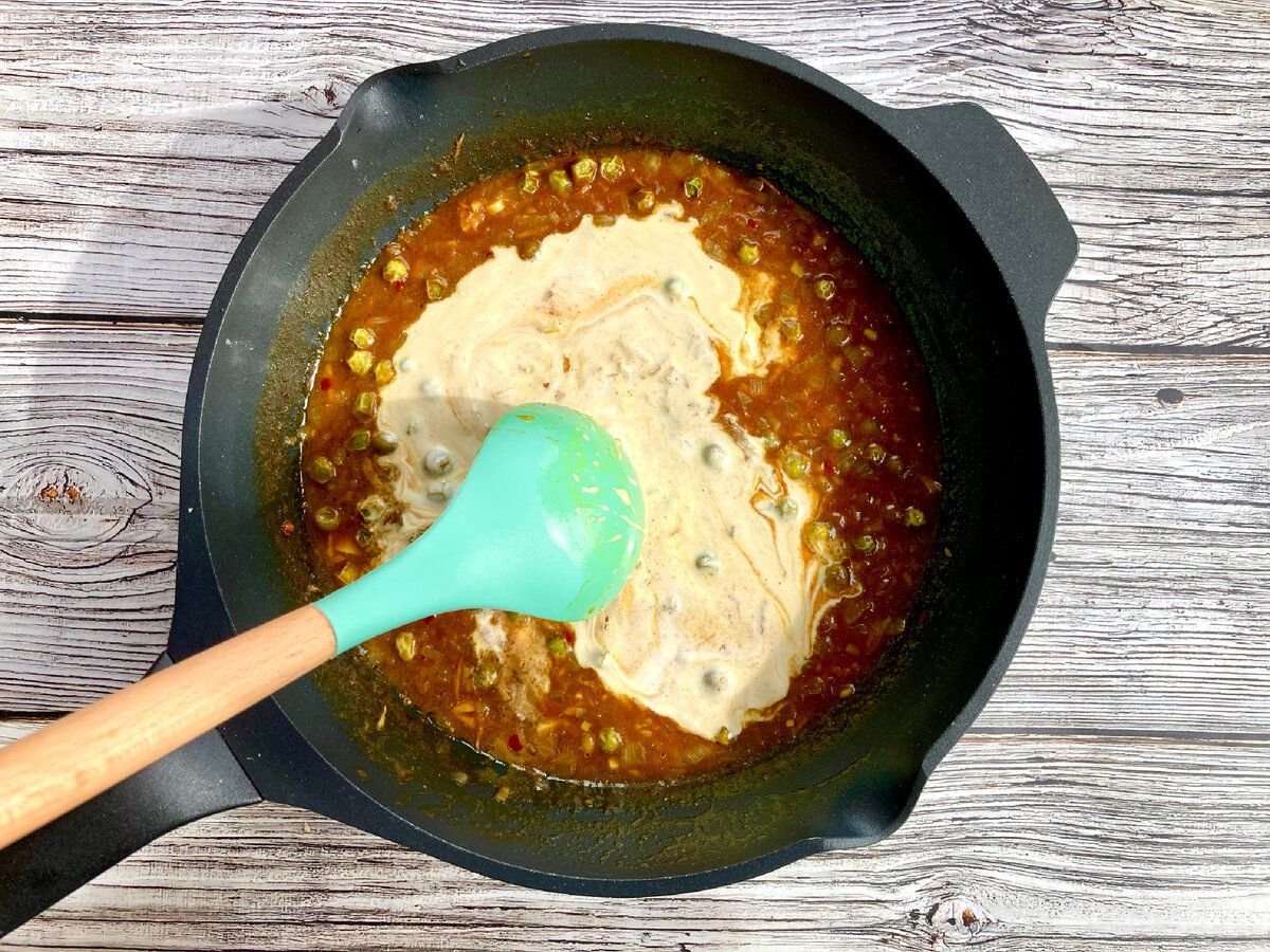 За бажанням можна кинути в соус трохи замороженого горошку чи інших овочів.