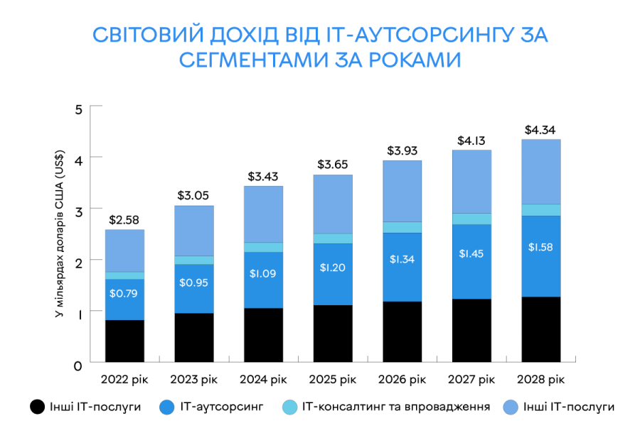 Сектор ІТ-аутсорсингу зміцнює свою присутність у бізнес-ландшафті. Згідно з останніми даними Statista, дохід ринку ІТ-послуг злетить до вражаючих $1 420,00 млрд у 2024 році, що значно перевищує попередні ринкові оцінки, які передбачали, що до 2027 року він сягне лише $904,9 млрд.