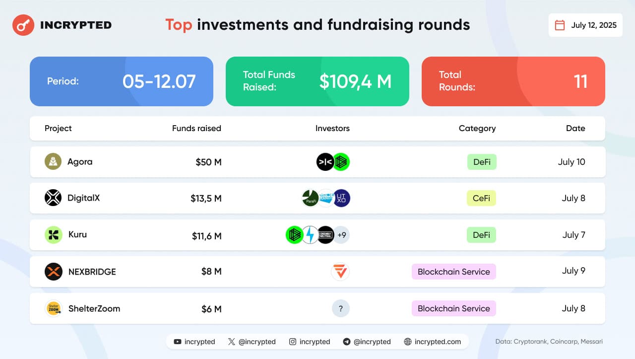 У період із 5 до 12 липня 2025 року 11 проєктів залучили інвестиції на загальну суму $109,4 млн. Лідерами за обсягом наданого фінансування стали проєкт Agora і компанія DigitalX.