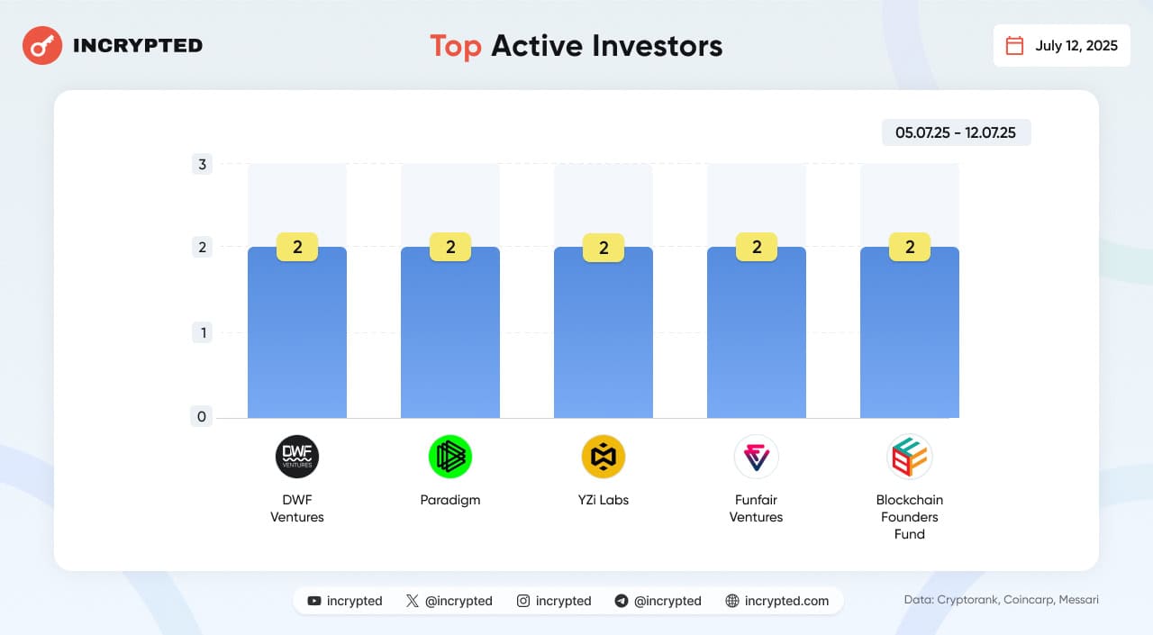 Топ-5 фондів за кількістю інвестицій у період з 5 по 12 липня, згідно з даними CryptoRank: