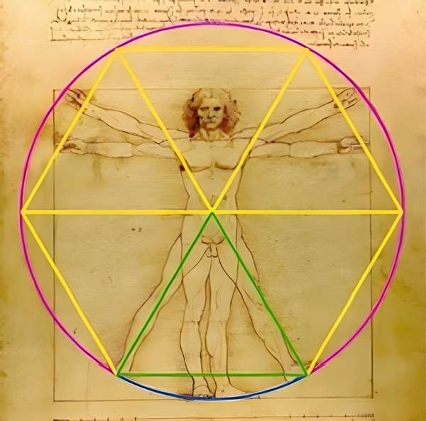 У записах самого Леонардо міститься опис форми, утвореної при розведених ногах і піднятих руках: «Простір між ногами буде рівностороннім трикутником». Обчислення підтверджують: висота від промежини до пупка та ширина між ступнями створюють співвідношення приблизно 1,64–1,65. Це майже ідентично тетраедричному співвідношенню 1,633 — унікально симетричній просторовій структурі.