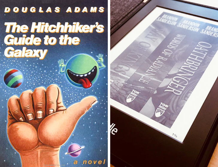 Путівник для подорожуючих автостопом по галактиці – класична електронна книга, яку описав Дуглас Адамс у 1979 році. Що цікаво, коли Адамс обговорював ідею путівника з колегою і другом Нілом Гейманом, той впевнено заявив, що якщо електронні книги коли-небудь з’являться, то стануть вироком для паперових. Дуглас Адамс заперечив, що паперові книги як акули, які існували ще до динозаврів і продовжують жити тому, що немає нічого кращого, ніж бути акулою.