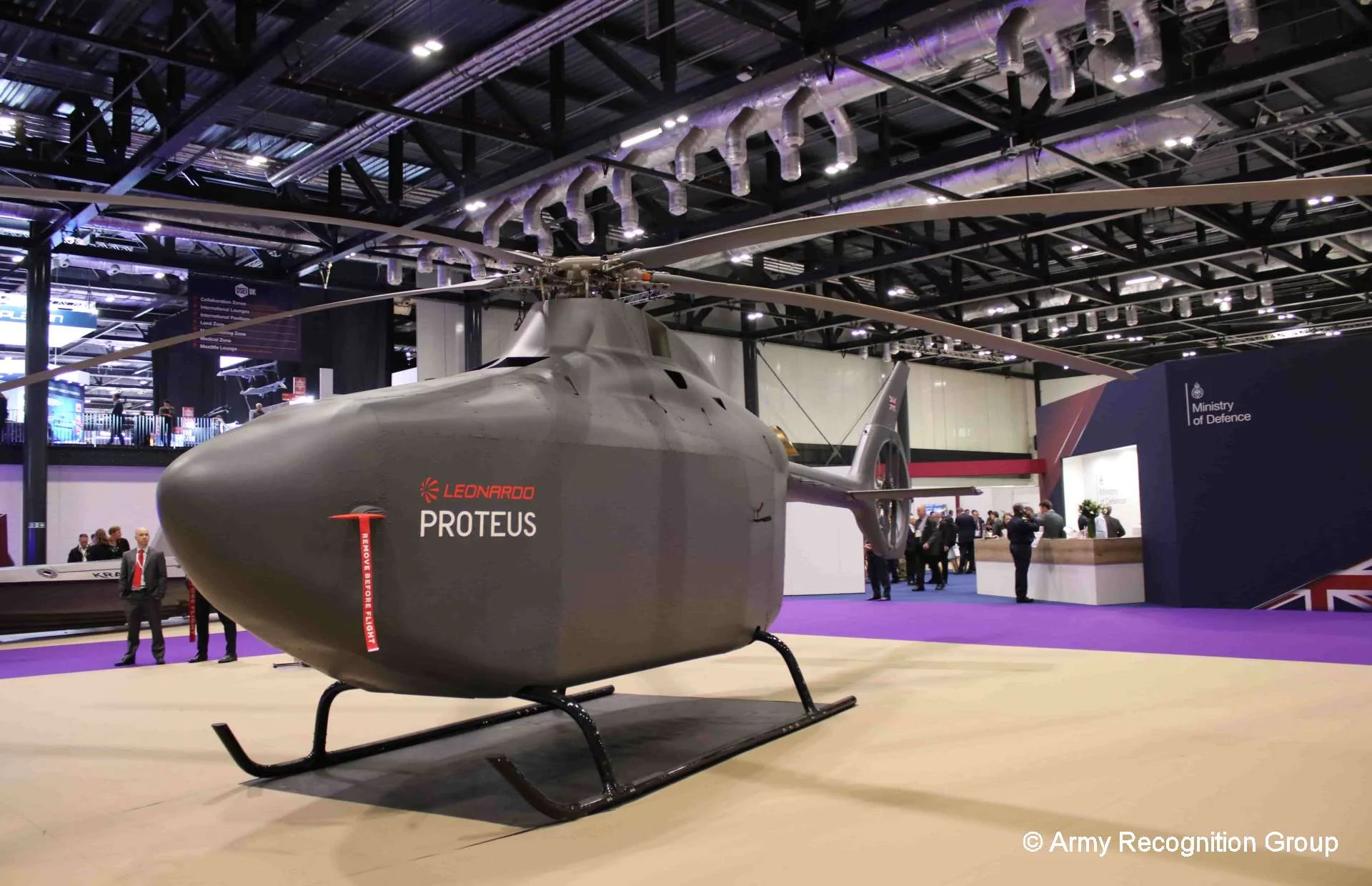 На виставці DSEI 2025 компанія Leonardo представила новий безпілотний гелікоптер Proteus, створений для підвищення можливостей протидії підводним загрозам. Апарат вагою до трьох тонн базується на архітектурі легкого вертольота Kopter AW09, але має повністю переобладнаний фюзеляж під безпілотні місії. Він здатний перевозити до 1 000 кг вантажу — від стандартних палет НАТО до сонобуїв і сенсорних систем для тривалих операцій.