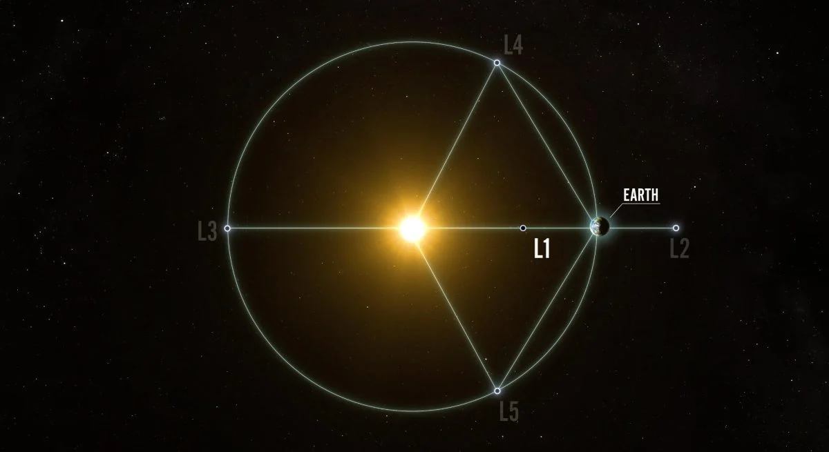 Художня концепція п’яти точок Лагранжа між Сонцем і Землею в космосі. У точках Лагранжа гравітаційне тяжіння двох великих мас протидіє одне одному, що дозволяє космічним апаратам зменшити витрату палива, необхідну для утримання позиції. Точка L1 системи Земля-Сонце забезпечує безперервний огляд Сонця і стане місцем проведення трьох нових місій з геліофізики в 2025 році: міжзоряного зонда NASA (IMAP), обсерваторії Carruthers Geocorona Observatory NASA та Space Weather Follow-On – Lagrange 1 (SWFO – L1) NOAA. Джерело: Концептуальна лабораторія зображень NASA/Кристофер Кім
